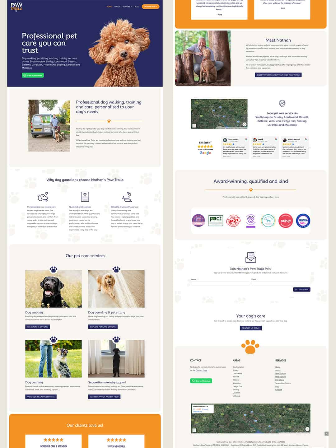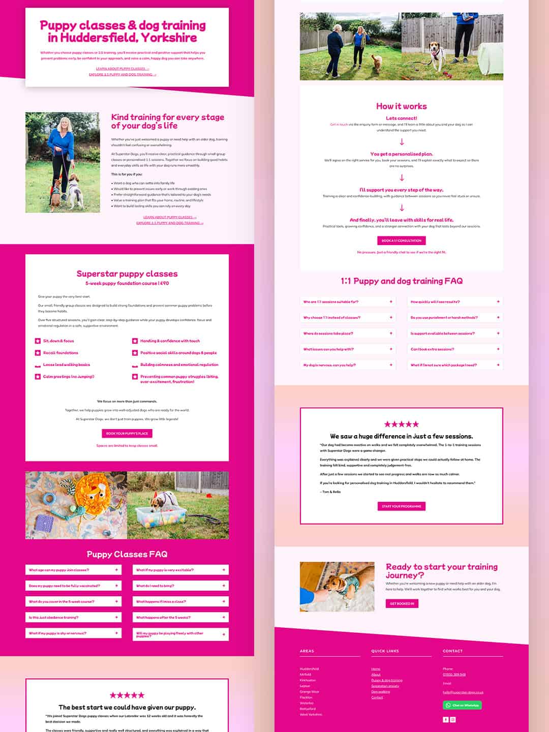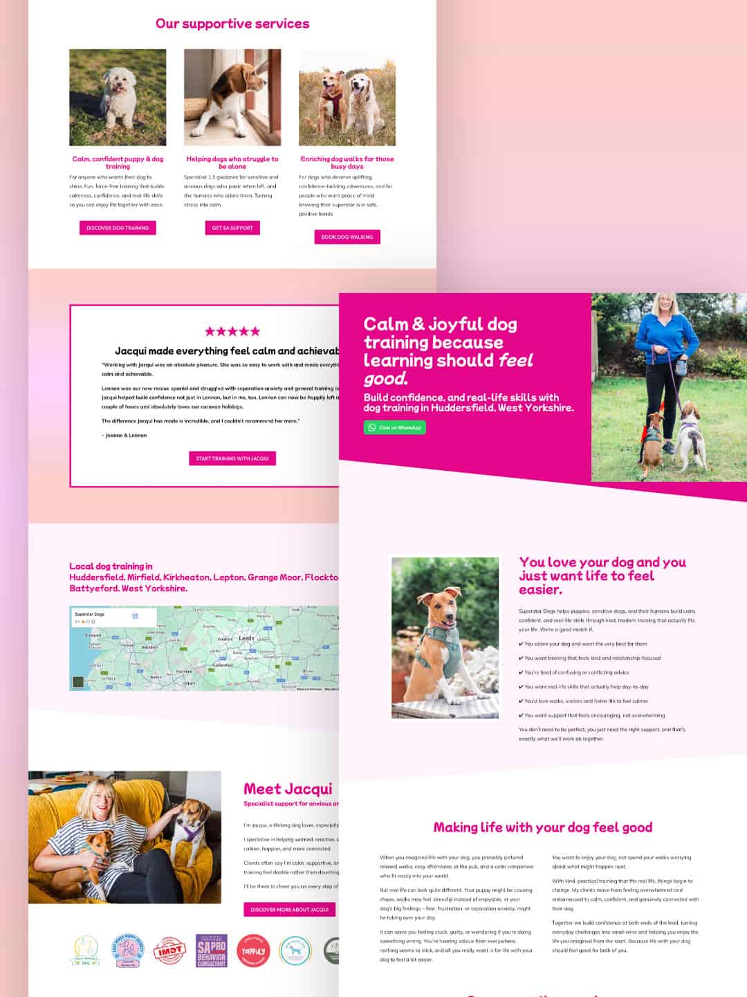 The design focuses on warmth, clarity, and ease of navigation, allowing visitors to quickly understand what support is available and how to get started. Behind the scenes, strong local SEO foundations help the site show up for people searching for puppy classes and dog training in Huddersfield and West Yorkshire.